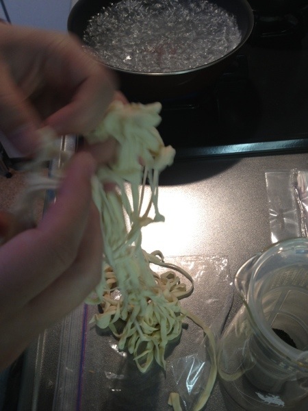 すぐに食べたくて、すぐに茹で始め。しいたけと鰹節のダシでめんつゆを作る。麺は9分半ほど茹でて、水で締めて、めんつゆに。