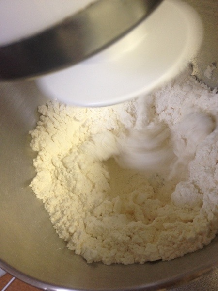 塩水を作る。よくまぜた小麦粉に、塩水を投入して、混ぜる。
