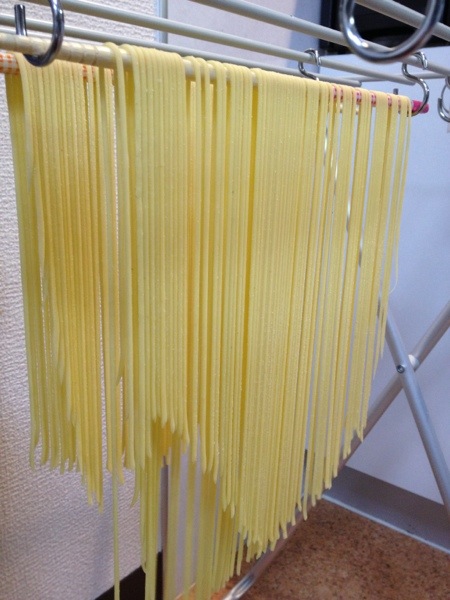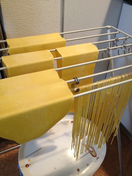 たぶん本だったと思うのだけど、「パスタの生地を伸ばしてから少し乾かす」という記述を読んだ覚えがあった。たまたま、今回実験したパスタの生地がずいぶん水分が多めだったので、なんとなく覚えていたその手法を実践してみた。