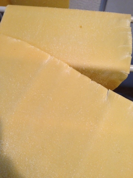 そして乾かしすぎた。生地の両脇がパキパキになってしまった。そしてこの状態ではパスタカッターを通らない。パキパキになるまで乾かしてちゃあダメなんだね。。。