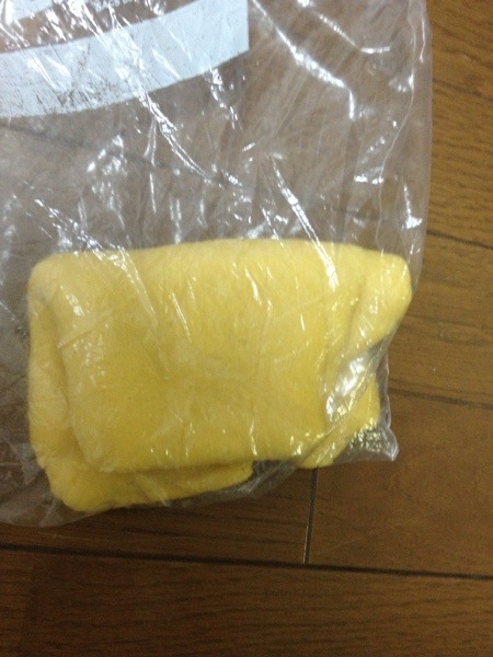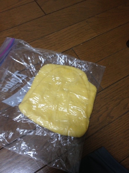 ある程度まとまってきたら、ジップロックに入れて、深夜番組を見ながら、踏み踏み。白い。かなり生地がべたついている。水分が多めに感じる。